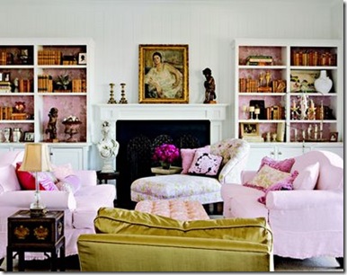 Now this room breaks and makes the rules in a different way- mostly ne shade of pink (though it still does have some deeper fuschias and a red), but it’s more relaxed while still being slightly formal. What’s the magic element- the pink linen slipcovers of course!